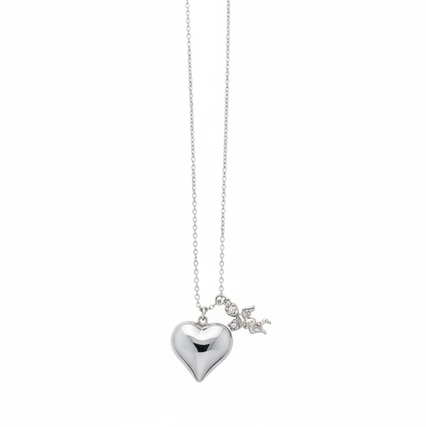 Una collana dal carattere deciso, con pendenti protagonisti: un angelo stilizzato e un cuore pieno e strutturato.